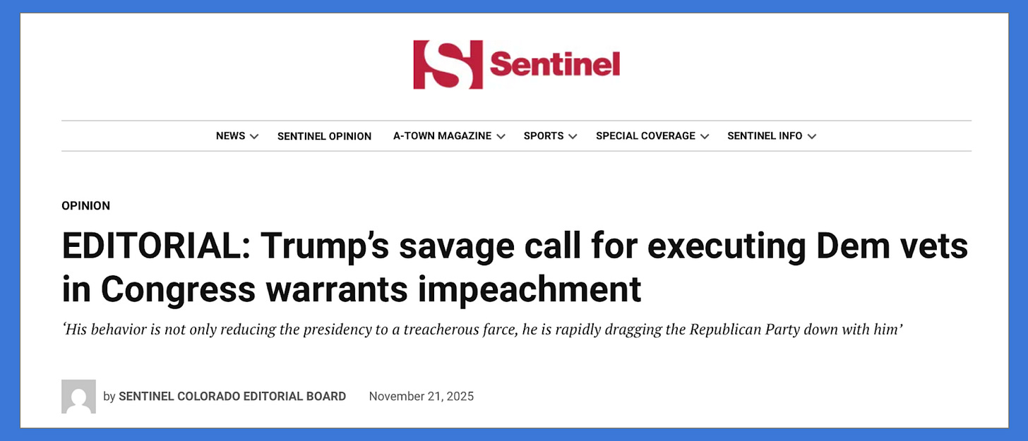 Sentinel Colorado is a news outlet with a strong sense of civic responsibility. It is a leading, local news source in Colorado. It has no paywall; its print editions are free on newsstands across the region, and its daily email E-dition (The Aurora Sentinel) is free to anyone who signs up online. Its groundbreaking call for impeachment on November 21, 2025, is courageous and patriotic; it is also an indictment of the leadership of other news organizations’ Editorial Boards who have failed to respond to a dangerous demagogue with calls for impeachment (or resignation). Defending the Constitution is not partisan.