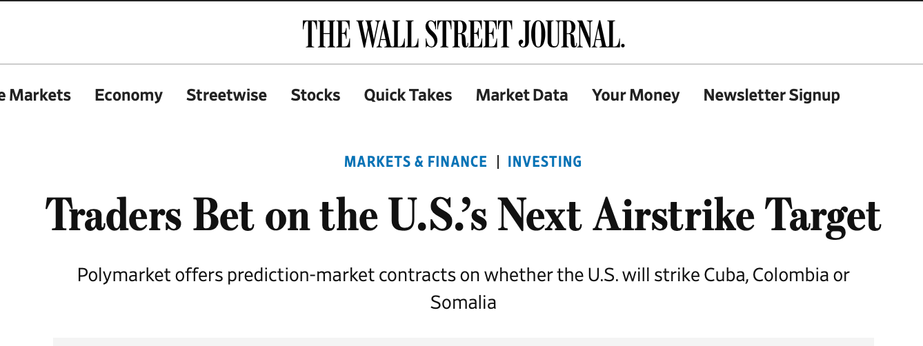 Rupert Murdoch’s esteemed Wall Street Journal has also relied on prediction markets as a substitute for genuine reporting. In November, 2025 it reported: