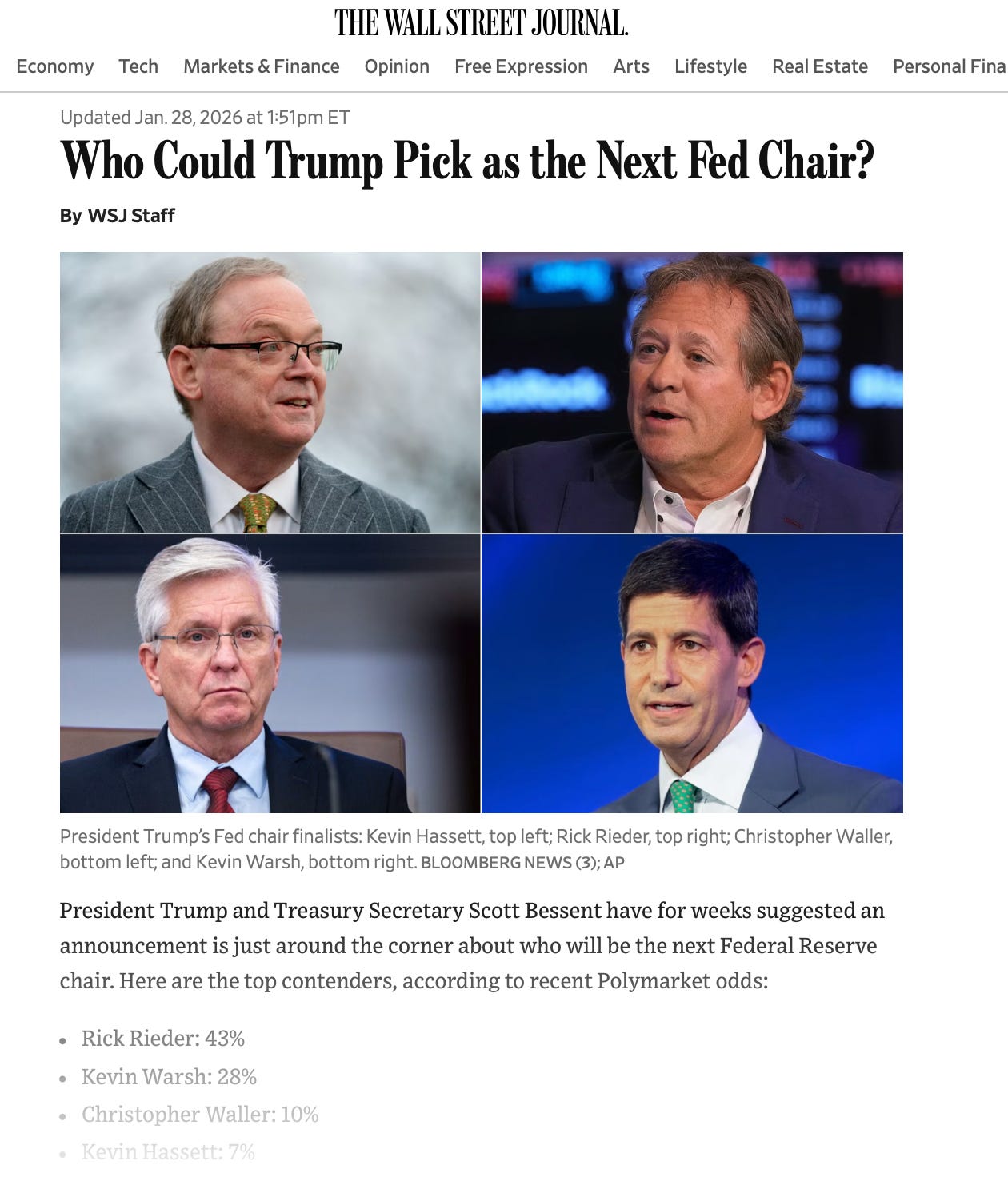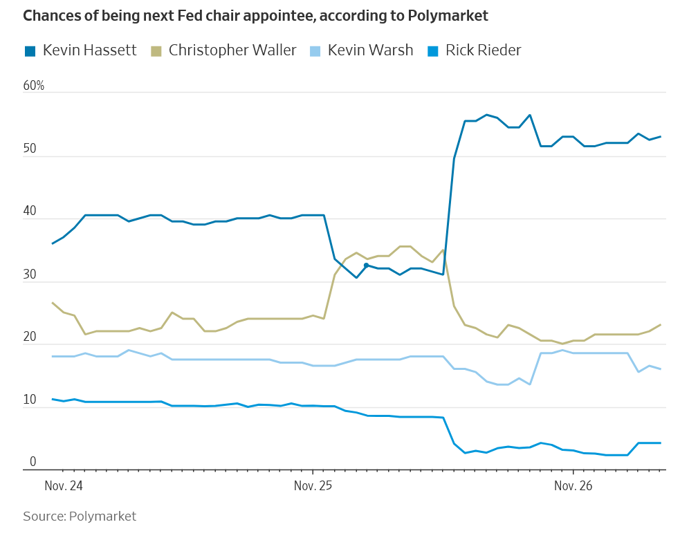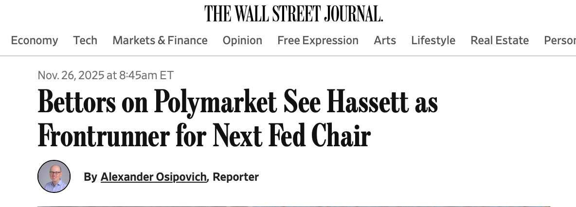 Bettors on Polymarket See Hassett as Frontrunner for Next Fed Chair “Traders on Polymarket have stepped up wagers on President Trump appointing Kevin Hassett the next chair of the Federal Reserve, after Bloomberg News reported he is the frontrunner to replace Fed Chair Jerome Powell.” And in further engaged prediction markets as journalism “Who Could Trump Pick as the Next Fed Chair?”