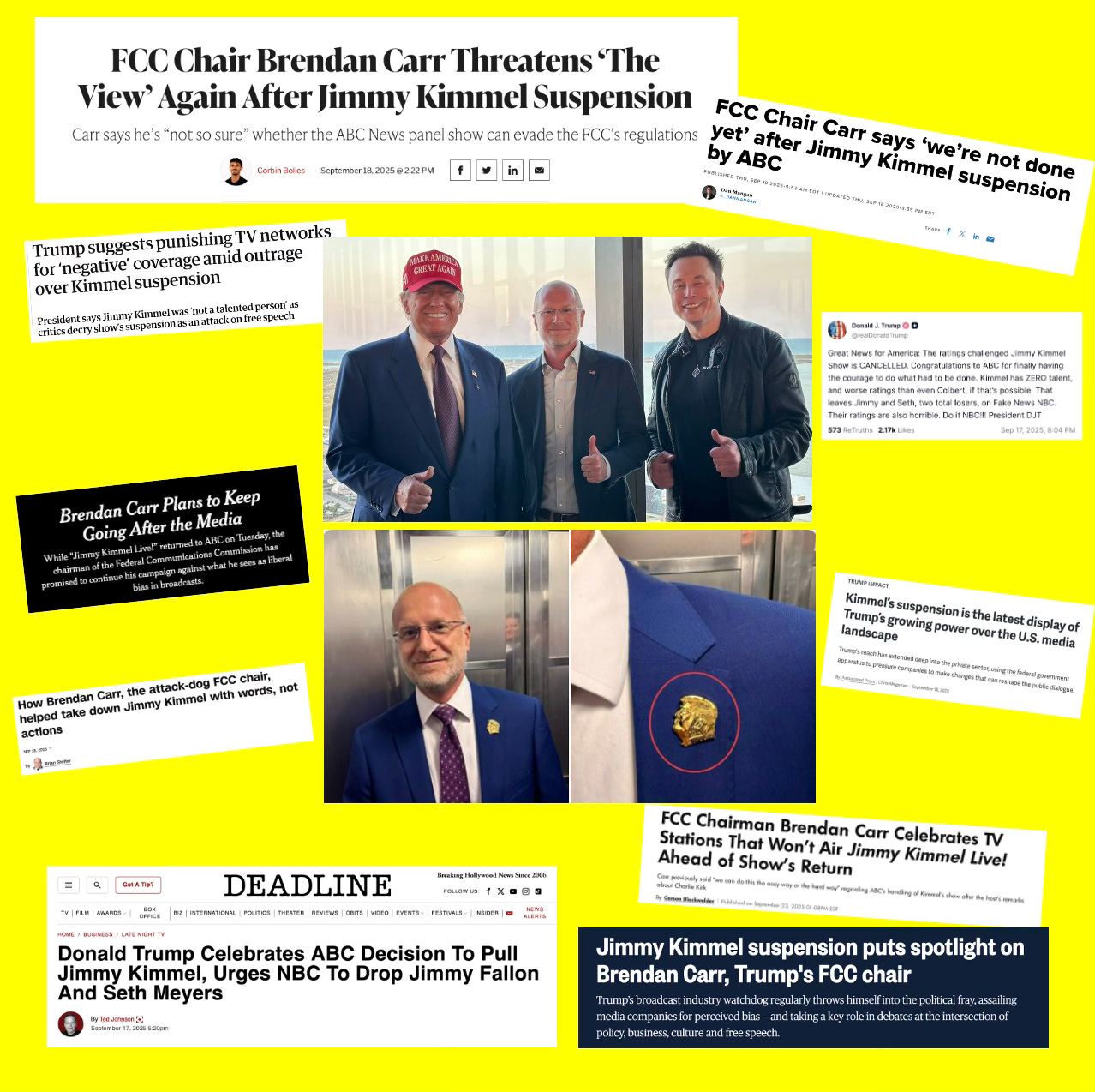 Government employee Chairman Carr should have to answer for his past actions and ongoing abuse of power. Republicans and Democrats can see that targeting Jimmy Kimmel – and strong-arming companies to do his bidding – is un-American.