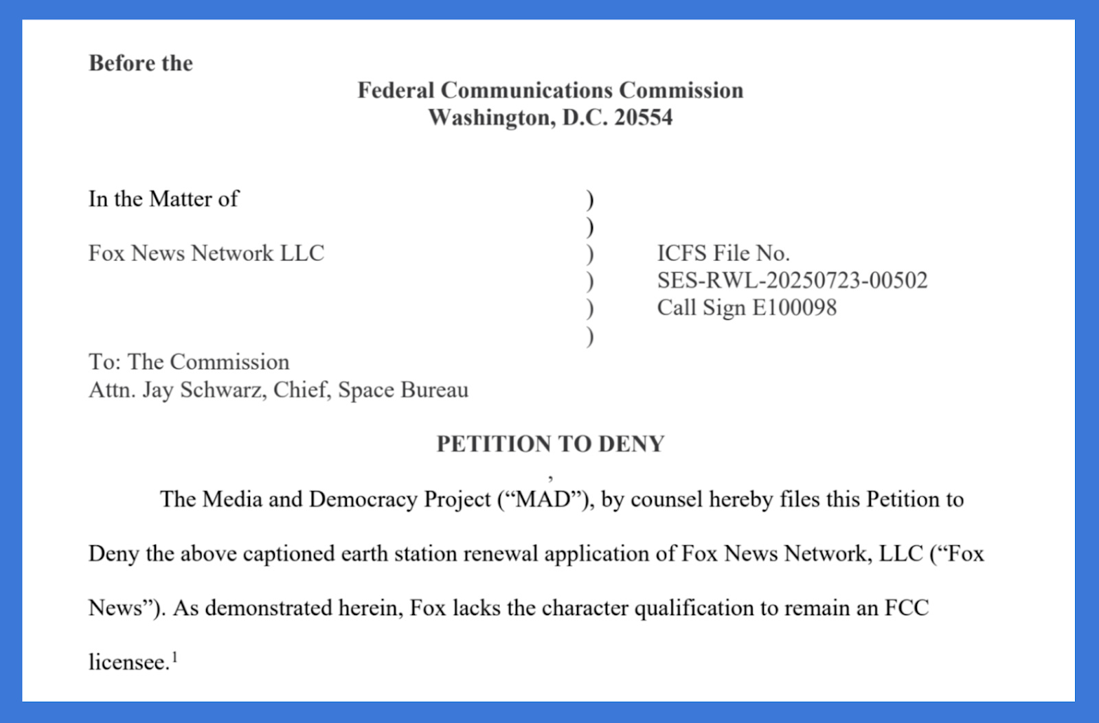 On November 18, 2025 the Media & Democracy Project (MAD) submitted a petition to the Federal Communications Commission (FCC) seeking to deny a Fox News Network (FNN) renewal application for the company’s satellite uplink license. Fox News used its satellite access to knowingly broadcast false information tied to the 2020 election, and we continue to assert that Fox (and its most senior leadership, including Rupert and Lachlan Murdoch) lacks the character qualifications to remain an FCC licensee.