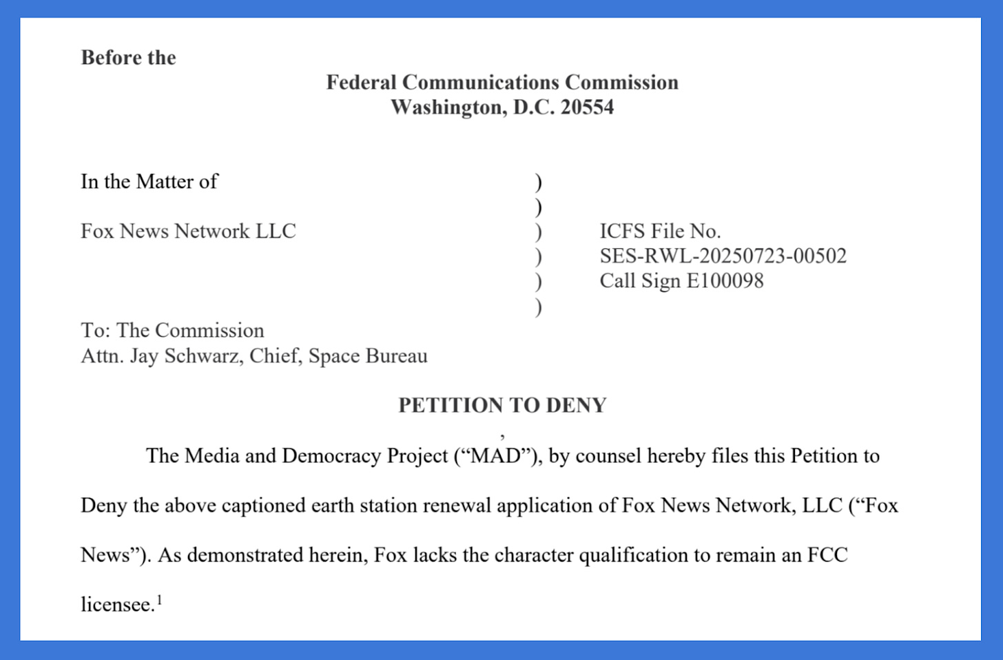 Justifications for the satellite petition are similar to our 2023 Petition to Deny that we filed against the broadcast license renewal of Fox-owned WTXF-TV in Philadelphia. That petition was dismissed along with others against ABC, NBC, and CBS in 2024. However, in 2025, Trump-appointed FCC Chairman Brendan Carr reinstated the partisan petitions against other networks but failed to reinstate the only petition based on a judicial finding. In February 2025, we filed an Application for Review of that decision, which remains pending.